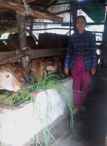 Để giúp chị có điều kiện phát triển kinh tế, năm 2020, Hội LHPN xã đã giới thiệu chị vay vốn Quỹ Hỗ trợ Phụ nữ phát triển kinh tế tỉnh Bến Tre. Với số tiền vay ban đầu 10.000.000 đồng chị làm vốn mua ve chai. Qua tìm hiểu mô hình nuôi bò sinh sản dễ chăm sóc, chi phí thức ăn thấp, không mất nhiều thời gian lại thích nghi được với điều kiện tại địa phương, nên tiền lời từ mua bán một phần chị dùng để trang trãi chi phí gia đình và trả dần gốc, lãi, gửi tiết kiệm hàng tháng, một phần chị tích lũy thêm vốn để mua thêm 03 con bò về nuôi. Nhờ chăm sóc tốt, từ 03 con bò giống ban đầu đến nay đàn bò sinh trưởng được 9 con, những con bò cái sinh sản tốt được chị giữ lại làm giống, hiện tại chị còn 4 con bò cái đang mang thai, đem lại nguồn thu nhập cho gia đình mỗi năm hơn 50 triệu đồng. Chăm chỉ, chịu khó, chồng chăn nuôi, vợ buôn bán gia đình chị đã tích lũy sửa lại nhà cửa và mua thêm 2000 m2 đất ruộng.