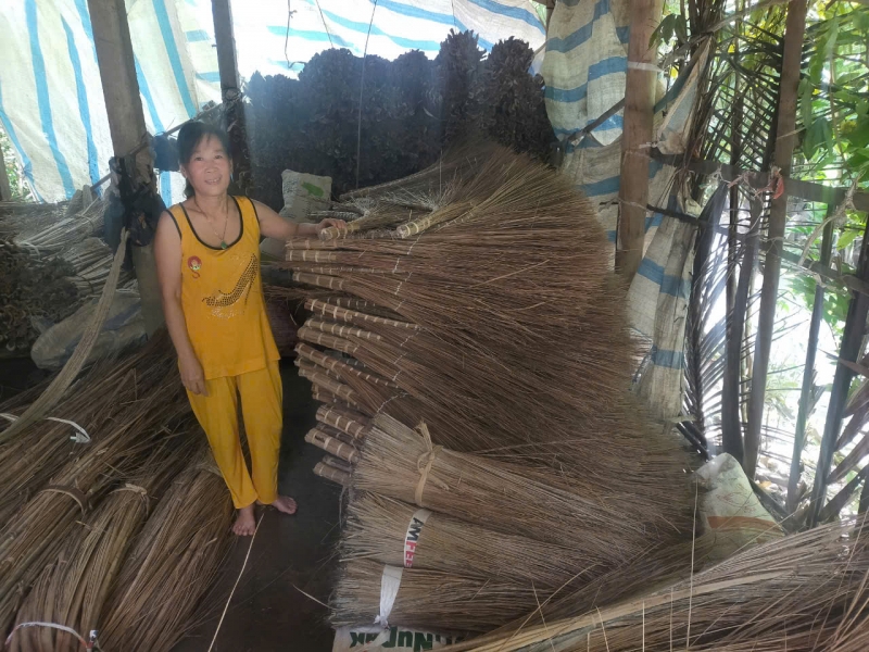 Cơ duyên may mắn đến với gia đình chị khi được biết nguồn vốn vay của Quỹ hỗ trợ phụ nữ phát triển kinh tế tỉnh Bến tre thông qua giới thiệu của chị Chi hội trưởng ấp trong lần đi họp Tổ phụ nữ vào tháng 10 năm 2022. Từ đó chị đã mạnh dạn đăng kí vay số tiền 20.000.000đ để về mở rộng mô hình sản xuất nhỏ của mình. Có được nguồn vốn anh chị mạnh dạn đầu tư thu mua cọng dừa, đầu cau, dây lạc sau đó về phơi khô xử lý để cho ra những thành phẩm đẹp mắt. Ban đầu mô hình của anh chị chỉ có 4 nhân công là anh chị và 2 người con ở chung nhà. Sau đó thấy thu nhập có phần khởi sắc hơn, từ năm 2023, 2024 đến hạn quay vòng nguồn vốn vay của Quỹ anh chị lại tiếp tục đăng kí xin vay vốn.