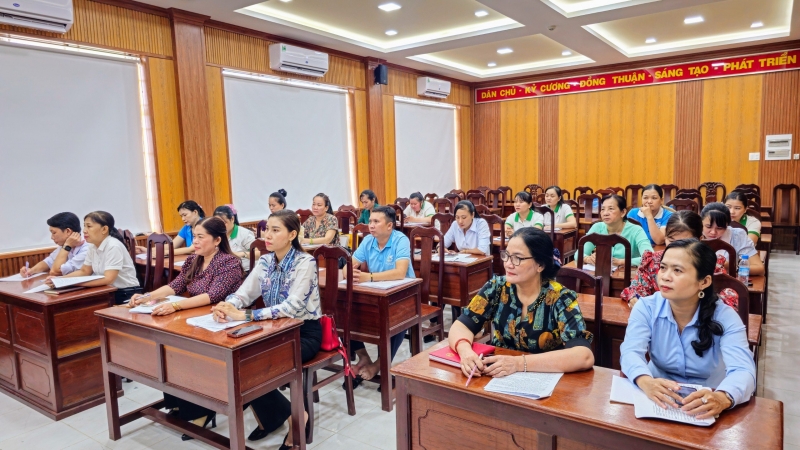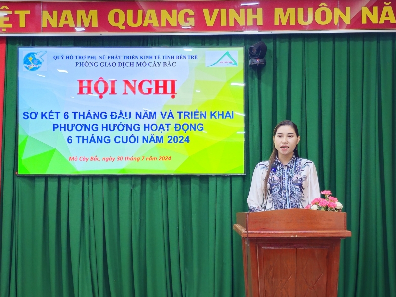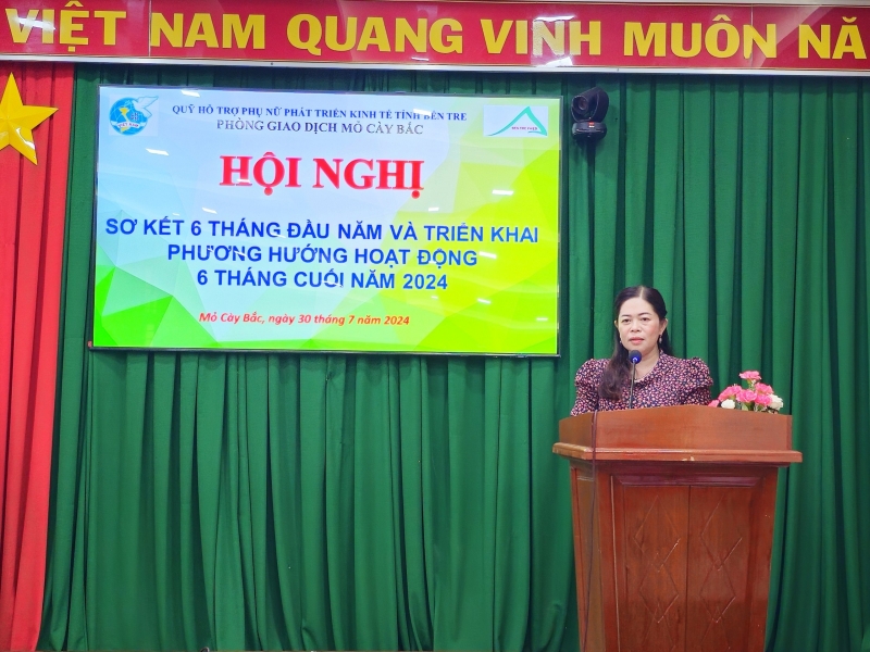 Chiều ngày 30/07/2024 tại Hội trường Khối vận huyện Mỏ Cày Bắc, PGD huyện Mỏ Cày Bắc tổ chức hội nghị sơ kết 6 tháng đầu năm 2024 các chương trình dự án TCVM. Đến tham dự Hội nghị có bà Bùi Thị Thuỳ Duy – Phó giám đốc Quỹ; Bà Nguyễn Thị Kim Oanh – Phó trưởng Ban Dân Vận Huyện ủy, bà Nguyễn Thị Bé Hồng - HUV- Chủ tịch HLHPN huyện - Trưởng PGD Quỹ HTPNPTKT huyện; lãnh đạo ngân hàng BIDV phòng giao dịch Mỏ Cày Bắc, lãnh đạo Hội LHPN huyện.
