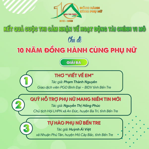 - 03 Giải ba thuộc về các tác giả Phạm Thành Nguyên – Giao dịch viên PGD Bình Đại – BIDV tỉnh Bến Tre - Thơ “Viết về em”, Nguyễn Thị Hồng Phúc -  Chủ tịch Hội LHPN xã An Đức huyện Ba Tri, tỉnh Bến Tre - bài nhạc theo điệu lý quạ kêu “Qũy hỗ trợ phụ nữ mang niềm tin mới”, và Huỳnh Ái Việt: trưởng ấp Giồng Giữa, xã Nhuận Phú Tân, huyện Mỏ Cày Bắc tỉnh Bến Tre - bài nhạc theo điệu Lý kéo chài “Tự hào phụ nữ Bến Tre”;