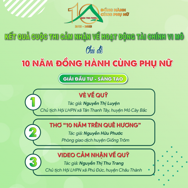 - 03 Giải đầu tư sáng tạo thuộc về các tác giả Nguyễn Thị Luyện – Chủ tịch Hội LHPN xã Tân Thanh Tây, huyện Mỏ Cày Bắc, tỉnh Bến Tre – “Vè về quỹ”, Nguyễn Hữu Phước – Phòng giao dịch huyện Giồng Trôm - Thơ “10 năm trên quê hương” và Nguyễn Thị Thu Trang – Chủ tịch Hội LHPN xã Phú Đức – huyện Châu Thành, tỉnh Bến Tre – “video cảm nhận về quỹ”;