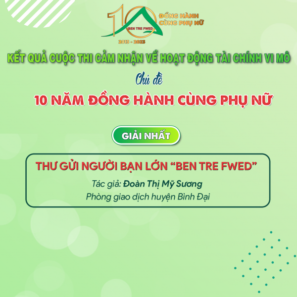 - 01 Giải nhất thuộc về tác giả Đoàn Thị Mỹ Sương – Phòng giao dịch huyện Bình Đại với bài dự thi: Thư gửi người bạn lớn “Ben Tre FWED” (có video kèm theo bài viết);