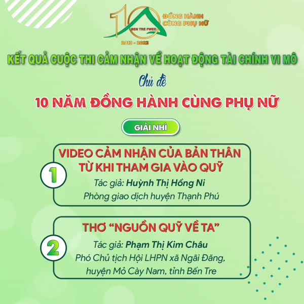 - 02 Giải nhì thuộc về các tác giả Huỳnh Thị Hồng Ni – Phòng giao dịch Thạnh Phú - Video cảm nhận của bản thân từ khi tham gia vào quỹ và tác giả Phạm Thị Kim Châu – Phó Chủ tịch Hội LHPN xã Ngãi Đăng, huyện Mỏ Cày Nam, tỉnh Bến Tre - Thơ “Nguồn quỹ về ta”;