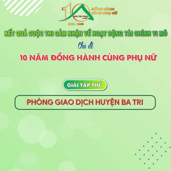Thực hiện chuỗi hoạt động chào mừng kỷ niệm 10 năm thành lập Qũy Hỗ trợ phụ nữ phát triển kinh tế tỉnh Bến Tre, 15 năm thực hiện chương trình tài chính vi mô. Quỹ đã phát động cuộc thi viết cảm nhận về hoạt động tài chính vi mô với chủ đề “10 năm đồng hành cùng phụ nữ” diễn ra từ ngày 17/4/2023 đến ngày 31/05/2023. Cuộc thi đã nhận được sự quan tâm, ủng hộ, tham gia nhiệt tình của các cán bộ Qũy, thành viên vay vốn và các đối tác quản lý vốn có liên quan như Hội LHPN xã, cụm trưởng, trưởng ấp trên địa bàn toàn tỉnh.