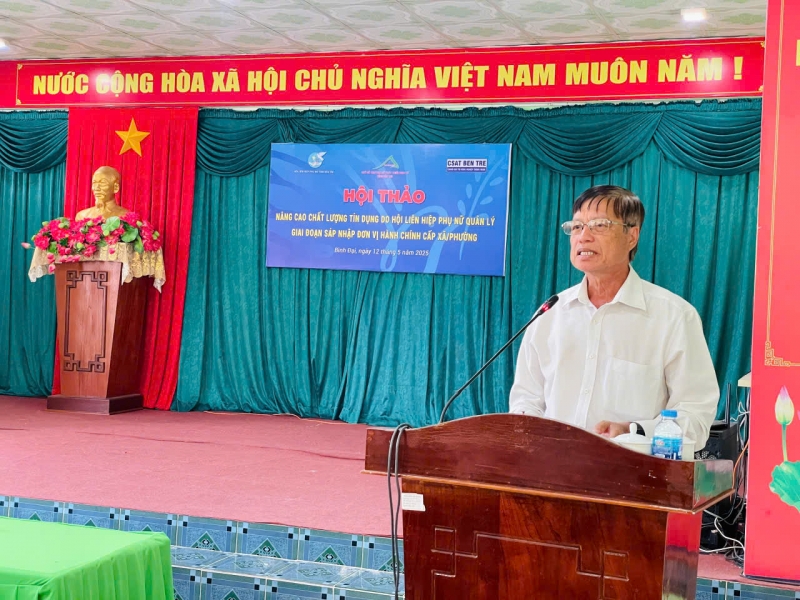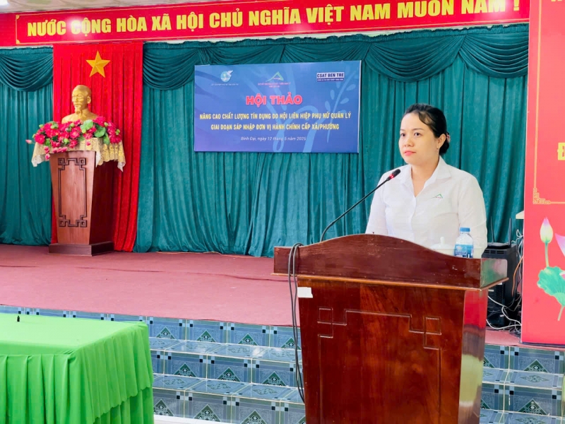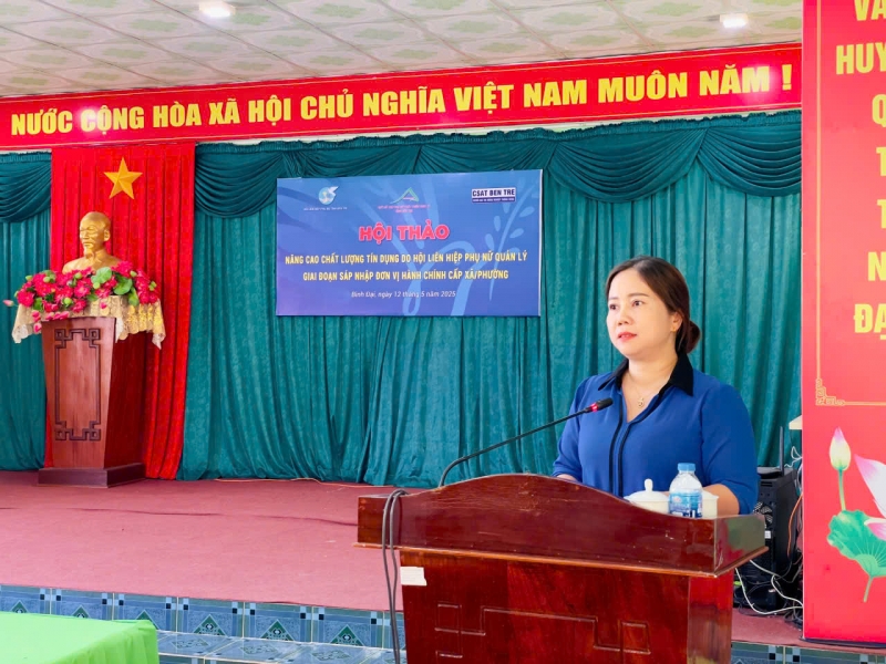 Nhằm đánh giá thực trạng chất lượng tín dụng do Hội LHPN các cấp quản lý sau sáp nhập đơn vị hành chính cấp xã/phường. Tăng cường năng lực quản lý, giám sát nguồn vốn, nhất là trong bối cảnh thay đổi địa giới hành chính và tổ chức bộ máy. Đồng thời, nắm bắt tâm tư, nguyện vọng, ý kiến phản ánh, kiến nghị của hội viên phụ nữ; kịp thời phát hiện những khó khăn, vướng mắt nhằm đề ra giải pháp, bổ sung điều chỉnh chính sách phù hợp với nhu cầu vốn vay của khách hàng trong tình hình mới. Ngày 12/05/2025, tại hội trường UBND huyện Bình Đại, Hội LHPN tỉnh Bến Tre, Quỹ hỗ trợ phụ nữ phát triển kinh tế tỉnh Bến Tre phối hợp Ban quản lý dự án CSAT tỉnh tổ chức Hội thảo "Nâng cao chất lượng tín dụng do Hội LHPN quản lý trong giai đoạn sáp nhập đơn vị hành chính cấp xã/phường".